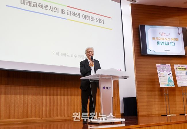 이번 특강은 ‘미래교육으로서 IB 교육의 이해와 의의’를 주제로 현 인하대학교 IB연구센터 초빙교수인 임영구 교수가 강연을 진행했다. 임영구 교수는 서울대 인문대학 미학과를 졸업하고 전 제주 표선고등학교 교장을 역임한 IB 교육 전문가로, 전국 최초 학교 단위 IB월드스쿨로 인증된 제주 표선고를 성공적으로 운영한 경험을 바탕으로 생생한 현장 사례를 제시했다.