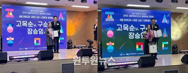(원투원뉴스) 세종특별자치시교육청평생교육학습관은 문해교육을 통해 배움의 기쁨을 알아가고 있는 구순덕(1950년생)어르신과 장승임(1950년생)어르신이 9월 18일에 보람종합복지센터 대강당에서 열린‘2025년 전국 성인문해교육 시화전 행사’에서 글아름상을 수상했다고 밝혔다.