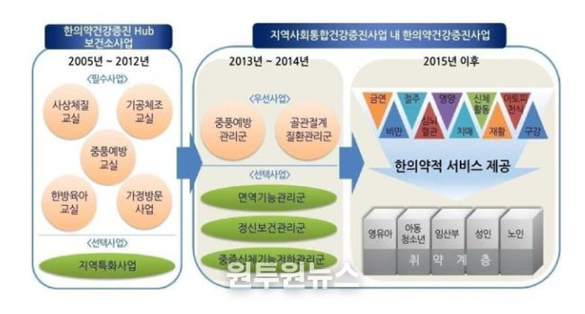 ‘한의약건강증진사업’은 2003년부터 전국 보건소를 중심으로 한의약 기반의 주민 밀착형 건강관리 서비스를 제공하는 사업이다. 만성질환 예방, 생활습관 개선, 갱년기 및 정신건강관리 등 일상 속 다양한 건강문제를 한의약적 접근으로 풀어나가며, 국민의 건강 수준 향상에 기여하고 있다.