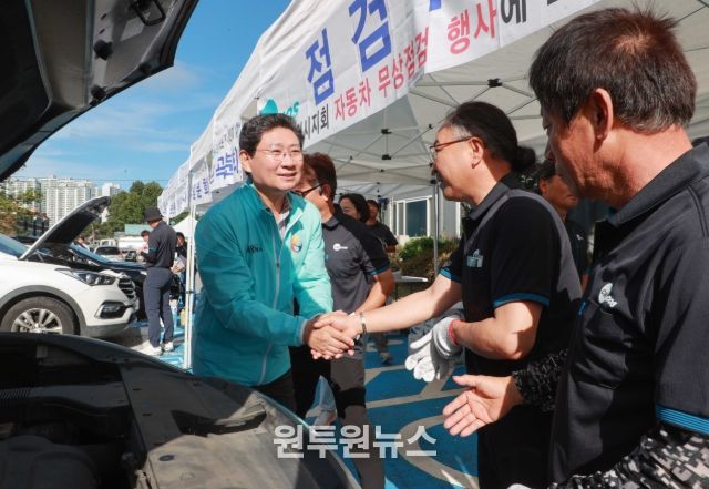 (원투원뉴스) 이상일 용인특례시장은 21일 역북동 가상현실 스포츠체험센터 주차장에서 열린 장애인차량 무상점검 행사를 찾아 경기도자동차전문정비사업조합 용인시지회 조합원을 격려했다.