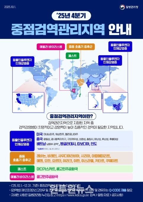 4분기에는 최근 3년 만에 에볼라바이러스병 유행을 선언한 콩고민주공화국을 포함하여 총 4종의 검역감염병 대상 21개국이 중점검역관리지역으로 지정된다. 중점검역관리지역을 체류·경유하는 사람은 '검역법' 제12조의2에 따라 Q-CODE(또는 건강상태질문서)를 통해 입국 시 검역관에게 건강 상태를 신고해야 한다.