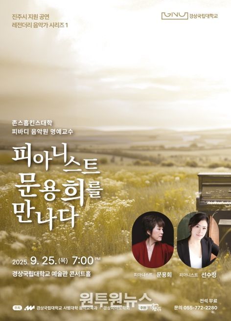 (원투원뉴스) 경상국립대학교 사범대학 음악교육과와 경상피아노학회는 세계적인 피아니스트 문용희 교수를 초청해, 9월 25일 오후 7시 경상국립대학교 예술관 콘서트홀에서 특별한 음악회 ‘피아니스트 문용희를 만나다’를 개최한다.