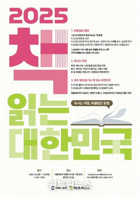 (원투원뉴스) 문화체육관광부는 한국출판문화산업진흥원과 함께 9월 26일부터 28일까지 서울어린이대공원(서울 광진구) 포시즌 가든과 팔각당 전시실에서 ‘독서는 여행, 북클럽은 동행’을 주제로 ‘2025 책 읽는 대한민국’을 처음 개최한다.