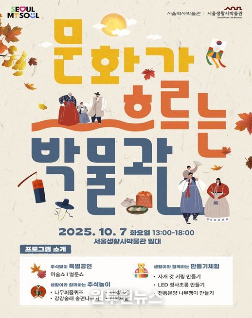 (원투원뉴스) 서울역사박물관은 7일 오후 1시부터 6시까지 분관인 서울생활사박물관(노원구 동일로174길 27)에서 ‘추석맞이 문화행사'문화가 흐르는 박물관'’를 개최한다. 이번 행사는 추석 연휴를 맞이하여 서울생활사박물관을 찾는 시민들에게 다채로운 문화 체험의 기회를 제공하고자 마련됐다.