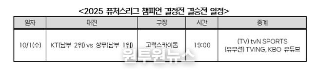 퓨처스리그 초대 챔피언이 결정될 결승전은 10월 1일(수) 오후 7시 고척스카이돔에서 열리며, 결승전은 TVING과 tvN SPORTS 및 KBO 유튜브를 통해 중계된다.