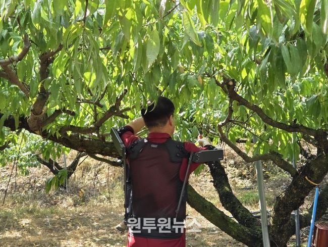 이날 현장평가는 세종시 복숭아·배 재배농가를 대상으로 진행됐으며, 근전도(EMG) 시스템을 활용해 착용 전과 후의 근육활성도를 비교하는 방식으로 이뤄졌다.