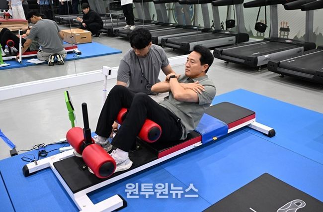 오 시장은 키‧몸무게, 체성분 검사 후 윗몸일으키기, 제자리멀리뛰기 등을 직접 해보며 근력, 근지구력, 유연성, 심폐지구력, 민첩성 및 순발력 등을 측정했다.