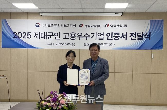 (원투원뉴스) 국가보훈부 인천보훈지청(지청장 직무대리 최은진) 제대군인지원센터는 2025년 10월 1일에 제대군인 주간을 맞아 영림그룹의 계열사인 영림화학(주)과 영림산업(주)을 방문하여 제대군인 고용 우수기업인증에 대한 현판식을 개최했다.