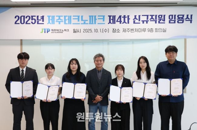 (원투원뉴스) 제주테크노파크(원장 지영흔, 제주TP)가 1일 제주벤처마루 9층 회의실에서 6명의 신규직원에게 임명장을 수여했다.