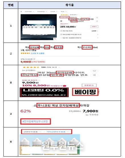 (원투원뉴스) 식품의약품안전처는 시중에서 판매되는 ‘무니코틴 표방 액상 흡입제품’에 대해 ‘의약외품(니코틴이 포함되지 않은 흡연욕구저하제, 흡연습관개선보조제)’ 오인 우려 광고로 보아 지난 9월 집중 점검을 실시했다.