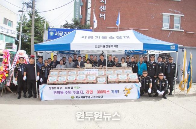 (원투원뉴스) 서곶자율방범 기동순찰대는 올해 창단 46주년을 맞이하여 지난 12일 ‘제24차 사랑의 모금함 전달식’을 통해 지역 내 어려운 이웃과 저소득 가정에게 전해달라며 연희동 행정복지센터에 라면 300박스를 전달했다.