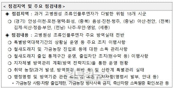 이번 점검은 지난 9월 12일 경기도 파주에서 과거보다 다소 이른 시기에 고병원성 조류인플루엔자가 가금농장에서 발생했고, 10월부터 겨울 철새가 본격 도래하면서 국내 추가 발생 가능성이 높아짐에 따라 선제적으로 농식품부, 행정안전부, 농림축산검역본부, 시도 관계관 합동으로 점검반을 구성하여 실시하는 것이다.