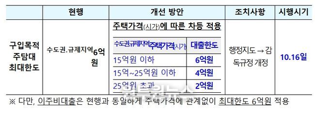 수도권·규제지역에 적용되는 주택구입목적 주담대의 대출한도(現 6억원)를 주택가격(시가) 수준에 따라 차등 적용한다. 수도권 · 규제지역의 ➊시가 15억원 이하 주택의 주담대 한도는 현행과 동일한 6억원, ➋시가 15억원 초과~25억원 이하 주택은 4억원, ➌시가 25억원 초과 주택은 2억원으로 대출한도를 차등 적용한다. 이를 통해 수도권·규제지역 내에서 대출을 활용한 고가주택 구입 수요를 보다 강력하게 관리해 나갈 예정이다.