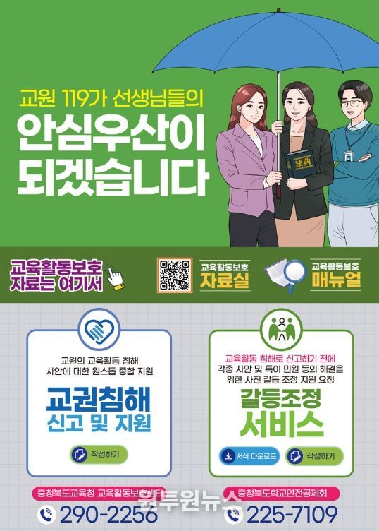 (원투원뉴스) 충청북도교육청이 17일, 교권보호를 강화하고 학교 현장의 안정화를 위해 교원 119 갈등조정 서비스를 운영한다고 전했다.