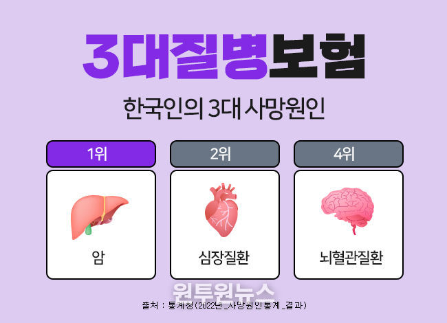 (원투원뉴스) 3대질병으로 일컬어지는 암, 뇌혈관질환, 심혈관질환은 한국인의 주요 사망원인에서 상위를 차지하고 있으며, 이에 대한 진단비를 집중적으로 보장해 주는 보험상품을 3대질병진단비 보험이라 할 수 있다.