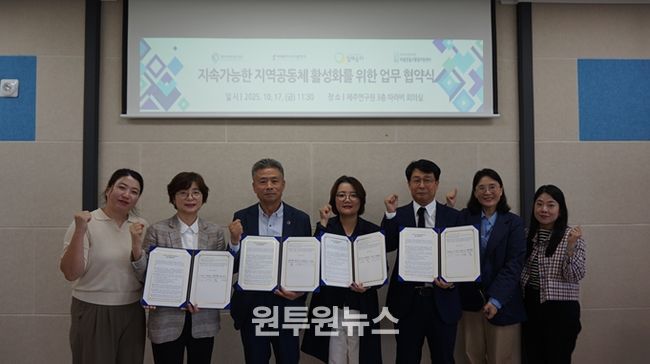 (원투원뉴스) 제주연구원(원장 유영봉) 제주사회복지연구센터(센터장 오윤정)는 2025년 10월 17일, 지속가능한 지역공동체 활성화를 위해 제주특별자치도 지속가능발전협의회, 일배움터, 제주특별자치도 마을만들기종합지원센터와 업무협약을 체결했다.