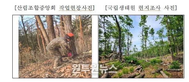 또한, 작업현장 사진과 현지조사 사진을 비교한 결과, 큰나무 위주의 간벌로 인해 식생이 단순화되고 산림 구조가 훼손된 정황이 확인됐다.