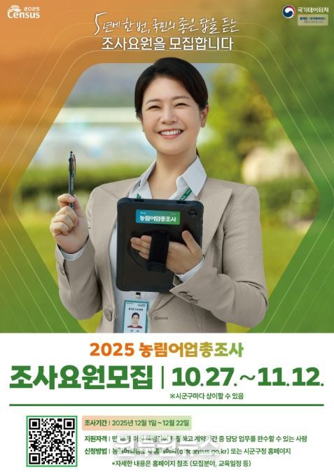 (원투원뉴스) 국가데이터처는 2025년 10월 27일부터 11월 12일까지 '2025 농림어업총조사' 현장조사 업무를 담당할 조사요원을 모집한다.