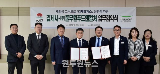 (원투원뉴스) 김제시는 27일 ㈜풀무원푸드앤컬처와 '새만금전주간' 고속도로 개통에 따라 새롭게 조성되는‘김제휴게소’운영에 따른 업무협약을 체결했다고 밝혔다.