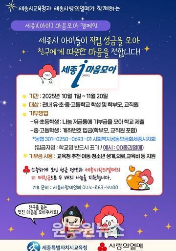 (원투원뉴스) 세종사회복지공동모금회는 세종시 아동·청소년이 나눔을 배우고 스스로 실천하는 참여형 기부 프로그램 '세종i(아이) 마음모아 캠페인'을 세종시교육청과 함께 본격 추진하고 있다.