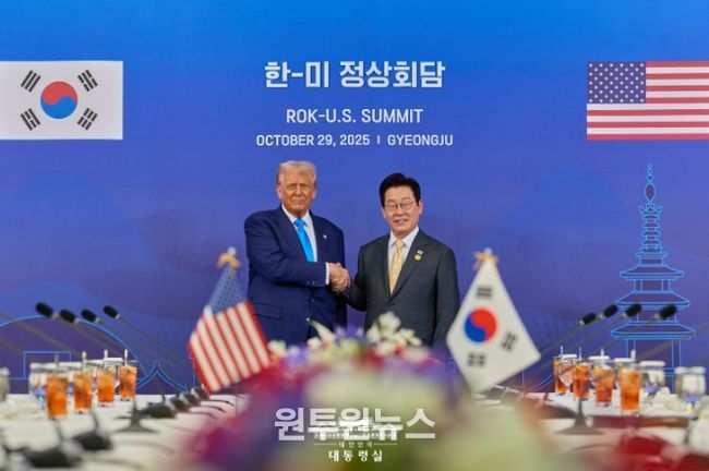 이재명 대통령이 두 달 만에 만난 트럼프 대통령을 직접 맞이했고, 트럼프도 이 대통령의 어깨를 두드리며 친근감을 표시했다.