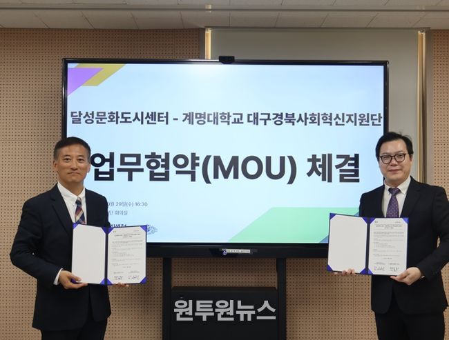(원투원뉴스) (재)달성문화재단(이사장 최재훈) 달성문화도시센터는 지난 29일 계명대학교 대구경북사회혁신지원단(단장 신진교)과 업무협약을 체결했다고 밝혔다.