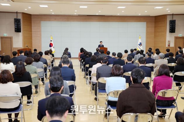(원투원뉴스) 윤건영 충청북도교육감이 3일 오전, 화합관에서 11월 월례조회를 개최했다.