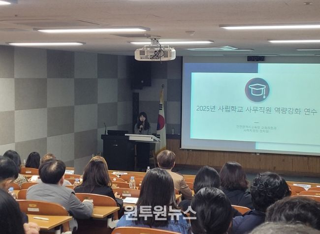 (원투원뉴스) 인천광역시교육청은 4일 평생학습관에서 사립학교 사무직원의 직무능력 향상과 사학기관의 건전·투명한 운영을 위해 ‘사립학교 사무직원 직무역량 강화 연수’를 실시했다고 밝혔다.
