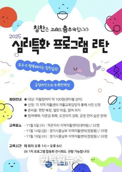 (원투원뉴스) 시흥시는 자활참여자의 정서적 역량 강화를 위해 지난 11월 5일 ‘2025년 자활참여자 심리특화 프로그램 2탄’을 대야동과 정왕동에서 진행했다. 이번 프로그램은 센터별 찾아가는 워크숍 방식으로 운영돼, 참여자들이 일상에서도 쉽게 참여하고 스스로 성장할 기회를 제공한다.