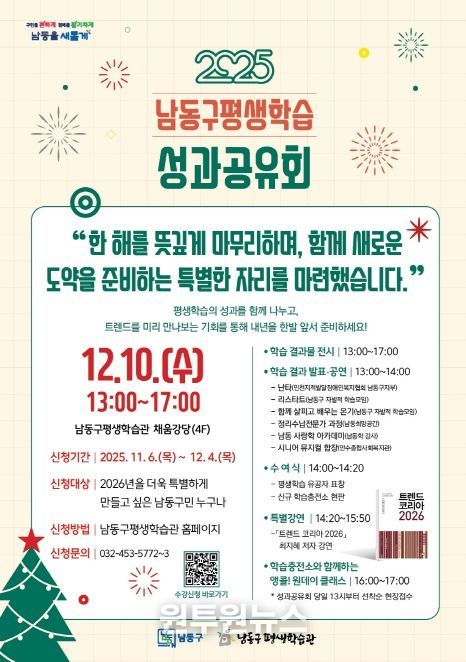 이번 성과공유회는 12월 10일 오후 1시부터 5시까지 남동구 평생학습관 채움강당에서 개최되며, 수강신청은 11월 6일부터 12월 4일까지 평생학습관 홈페이지를 통해 선착순으로 진행된다.