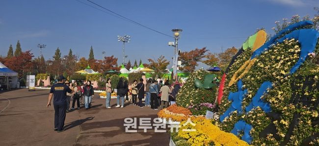 올해 국화작품전시회는 지난해보다 5000여 점이 늘어난 10만 5000여 점의 다채로운 작품들이 전시되고 있는데, 다양한 조형작과 모형작, 꽃동산, 포토존 등 아름다운 작품들과 다양한 콘텐츠가 함께하면서 관람객들의 발길을 사로잡고 있다.
