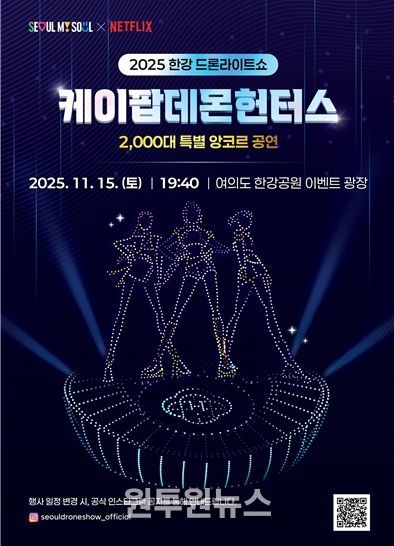 (원투원뉴스) 올 한 해 한강의 밤하늘을 화려한 드론 불빛으로 수놓으며 시민과 관광객들로부터 큰 사랑을 받은 ‘한강 드론 라이트 쇼’가 15일 저녁 7시 40분, 여의도한강공원에서 ‘케이팝 데몬 헌터스’를 주제로 마지막 행사를 앙코르 공연으로 장식한다.