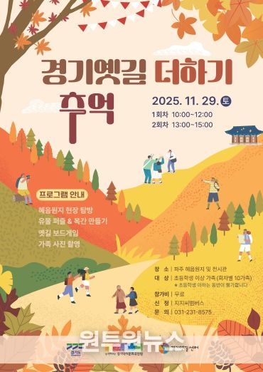 (원투원뉴스) 경기문화재단 경기역사문화유산원는 오는 11월 29일 토요일, 의주길에 위치한 파주 혜음원지 일대에서 초등학생 이상 자녀를 둔 가족을 대상으로 하는 역사 체험 프로그램 ‘경기옛길 더하기 추억’을 개최한다고 밝혔다.