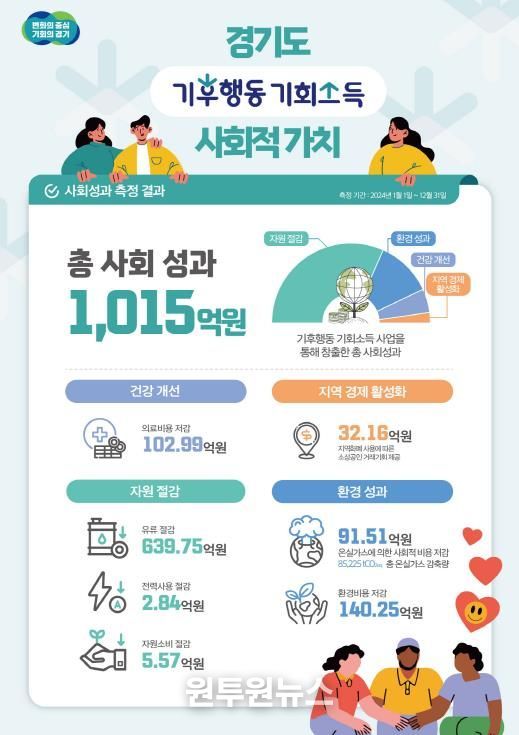 (원투원뉴스) 경기도가 ‘기후행동 기회소득’ 사업의 사회적 성과를 정량적으로 측정한 결과, 2024년 한 해 동안 총 1,015억 원의 사회적 가치가 창출됐다는 조사결과가 나왔다. 특정 정책사업의 환경적·경제적·사회적 효과를 금액으로 환산해 분석한 것은 이번이 국내 지방정부 가운데는 처음이다.