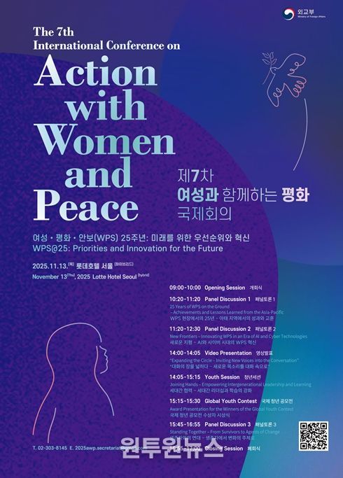 (원투원뉴스) 외교부는 11월 13일 롯데호텔 서울에서 제7차 '여성과 함께하는 평화' 국제회의를 개최한다. 이번 국제회의는 유엔 여성ㆍ평화ㆍ안보(Women, Peace and Security, WPS) 의제 논의 25주년을 맞아 WPS 의제의 “미래를 위한 우선순위와 혁신”이라는 주제로 개최된다.