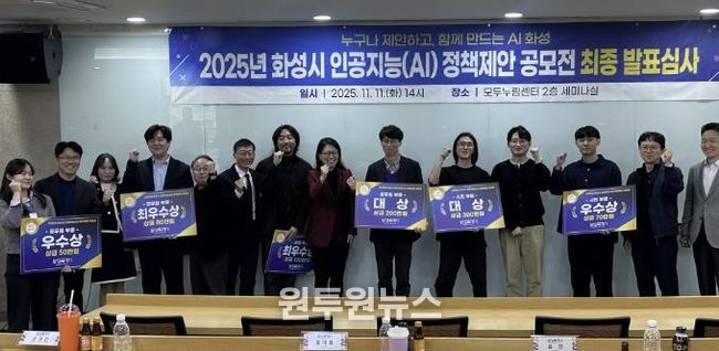 (원투원뉴스) 화성특례시는 지난 11일 모두누림센터 세미나실에서 ‘2025년 인공지능(AI) 정책제안 공모전’의 최종 발표심사를 끝으로 약 3개월간 이어진 공모전을 성황리에 마무리했다.