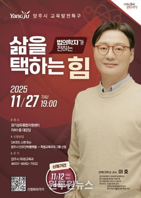 (원투원뉴스) 양주시는 오는 11월 27일, 경기섬유종합지원센터 지하 1층 대강당에서 전북대학교 의과대학 법의학자 이호 교수를 초청해 ‘법의학자가 전하는 삶을 택하는 힘’을 주제로 2025년 양주시 교육발전특구 전문가 특강 3차를 개최한다.
