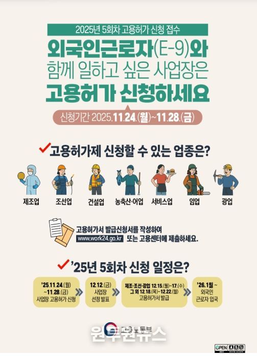 (원투원뉴스) 고용노동부는 11월 24일부터 11월 28일까지 전국 지방고용노동관서를 통해 외국인근로자(E-9)에 대한 올해 5회차 신규 고용허가 신청을 받는다.