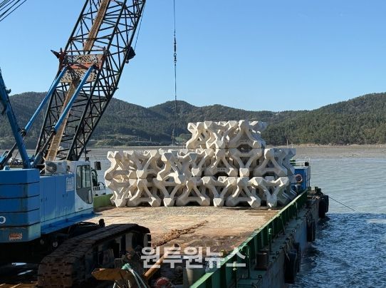 (원투원뉴스) 신안군은 다이아몬드 해역 내 수산자원 산란·서식장 조성 일환으로 지난 9월 인공어초 68개 설치에 이어, 11. 12일 수요일 올해 마지막 인공어초 123개를 추가로 투하했다.