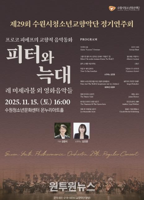 (원투원뉴스) 수원시청소년청년재단 수원청소년문화센터에서는 오는 11월 15일 오후4시, 온누리아트홀에서 제29회 정기연주회를 개최한다. 이번 연주회는 ‘프로코 피에프의 교향적 음악동화 '피터와 늑대'’를 중심으로, 세대를 아우르는 감동의 영화음악을 함께 선보이며 청소년 단원들의 풍성한 음악적 성장을 보여줄 예정이다.