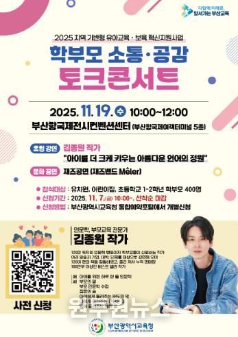 (원투원뉴스) 부산광역시교육청은 오는 19일 오전 부산항국제전시컨벤션센터에서 유치원‧어린이집‧초등학교(1~2학년) 학부모 400명을 대상으로‘아이를 더 크게 키우는 아름다운 언어의 정원’을 주제로 학부모 소통‧공감 토크콘서트를 개최한다.