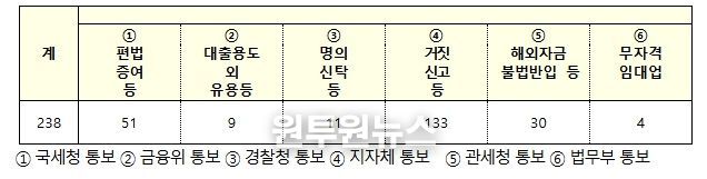 ① (해외자금 불법반입) 해외에서 1만 달러를 초과하는 현금을 휴대반입 후 신고하지 않거나, ‘환치기(외국환은행을 거치지 않고 자금을 불법반입)’를 통해 자금을 반입한 것으로 의심되는 경우 39건