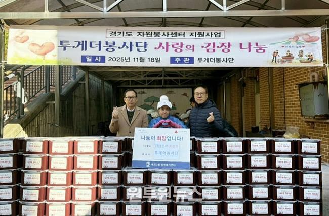(원투원뉴스) 투게더봉사단은 지난 18일, 세류2동 행정복지센터에 김장김치 10kg 60상자를 기부했다.