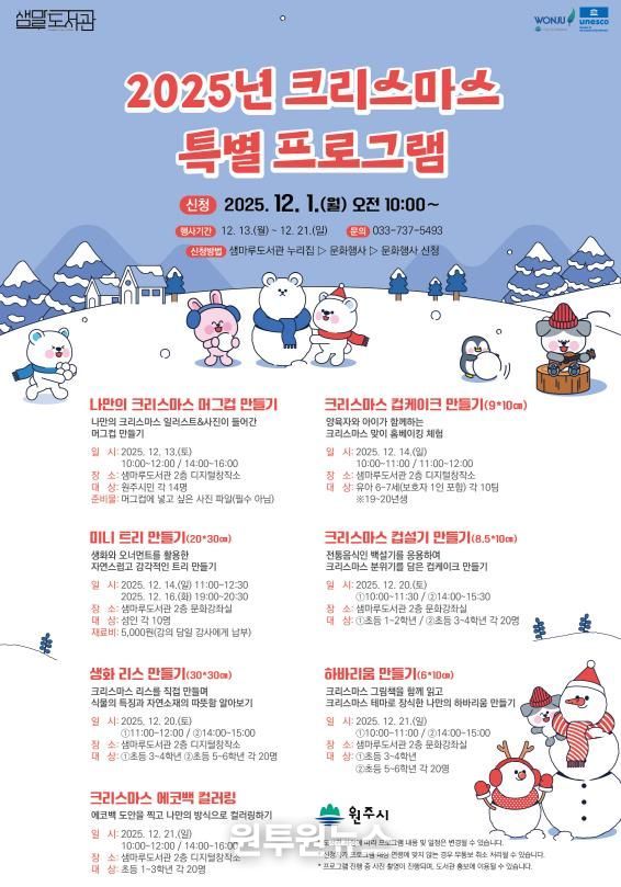 (원투원뉴스) 원주시 샘마루도서관은 크리스마스를 맞아 오는 12월 13일부터 21일까지 ‘크리스마스 특별 프로그램’을 운영한다.