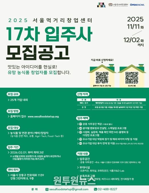 (원투원뉴스) 서울시는 전 세계적으로 확산 중인 K-푸드 열풍 속에서 농식품 분야 유망 스타트업의 성장을 본격 지원하기 위해 ‘서울먹거리창업센터’ 신규 입주기업을 12월 2일까지 공개 모집한다고 밝혔다.