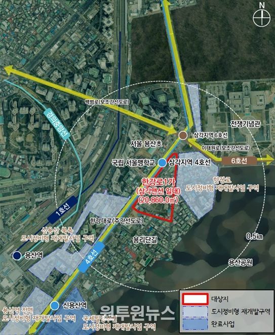 한강로1가 도시정비형 재개발구역은 지하철 4, 6호선 삼각지역 역세권 내에 위치하여 2025 도시환경정비기본계획(2016)에 따라 정비예정구역으로 지정되어 도심 기능연계, 노후 주거환경 정비 등을 목표로 용산구에서 정비구역 지정 및 정비계획(안) 마련을 추진했다.