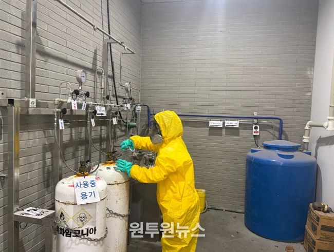 특히 방독마스크 착용 후 누출 밸브 차단, 살수장치 가동 등 현장 대응 과정까지 실제 상황과 유사하게 실시함으로써 직원들의 초기 대응능력과 시설 내 안전관리 체계를 점검하는 데 중점을 뒀다.