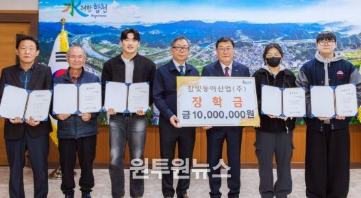 (원투원뉴스) 합천군은 참빛동아산업(주)(대표: 이해룡, 합천군 율곡면 소재)이 21일 합천군을 방문해 지역 학생들의 학업 지원을 위해 합천군 출신 5명의 대학생에게 각 200만원씩 총 1,000만원 규모의 장학금을 전달했다고 밝혔다.