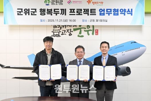 (원투원뉴스) 군위군은 21일 행복나래 주식회사, 행복도시락사회적협동조합과 함께 '군위군 행복두끼 프로젝트' 업무협약을 체결했다. 이날 협약식에는 김진열 군수를 비롯해 행복나래(주) 조민영 본부장, 행복도시락사회적협동조합 최준 사무국장이 참석했다.