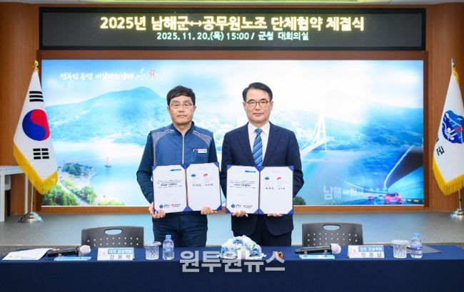 (원투원뉴스) 남해군은 20일 군청 대회의실에서 전국공무원노동조합 경남지역본부 남해군지부와 상생과 협력을 위한 2025년 단체협약을 체결했다고 밝혔다.